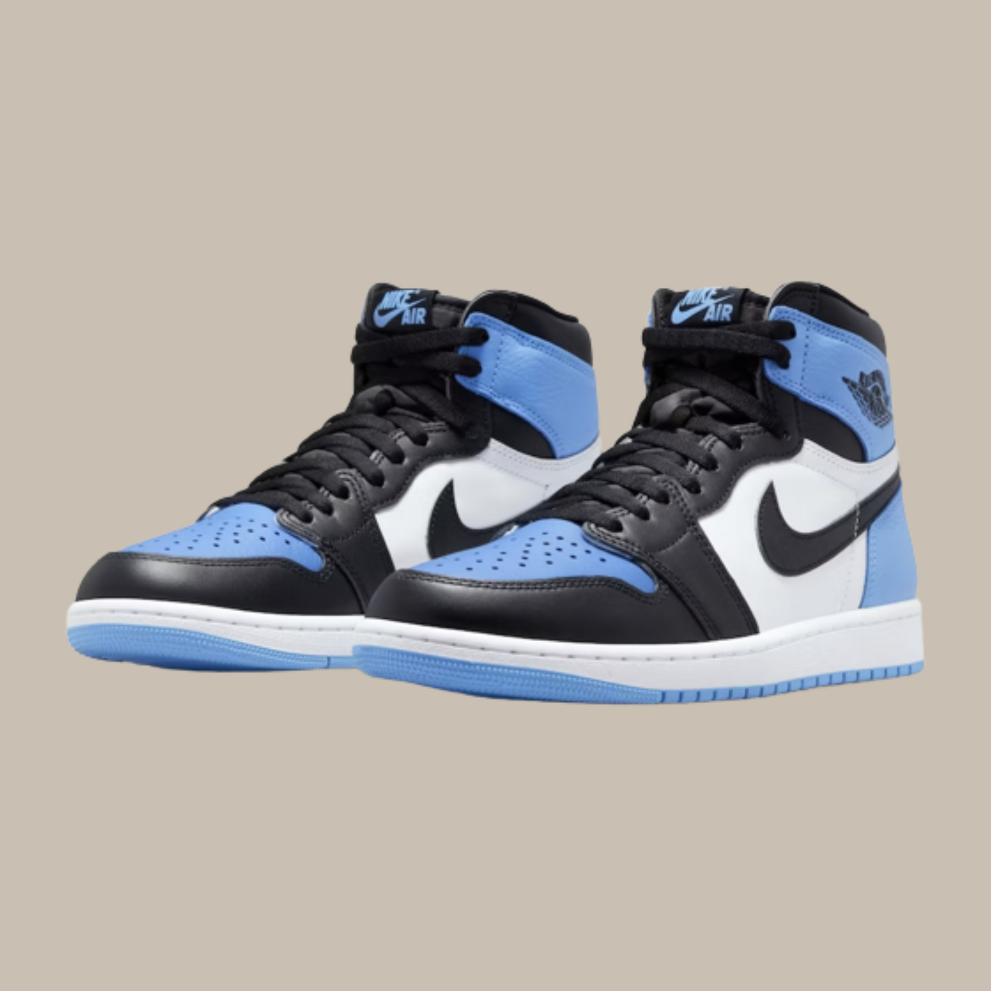 The Nike Air Jordan 1 Retro High OG 'UNC Toe', the model known for their high ankle look, represents the all-time favorite colorway for sneakerheads. The all leather colorway exists of black, white and of course, the iconic ’University’ blue shade. The blue tone can be found at the toebox, heel and outersole. The black shade is contrasted at the Swoosh and collar of the sneaker while white being the base color of the overall model, which also is repeated at the midsole which gives the cleanest, crispiest look. Many will stand by the fact that you can’t go wrong with this colorway, a true OG! The Nike Air Jordan 1 Retro High OG 'UNC Toe' silhouette fits under every outfit and can accidentally make you a fashion icon.